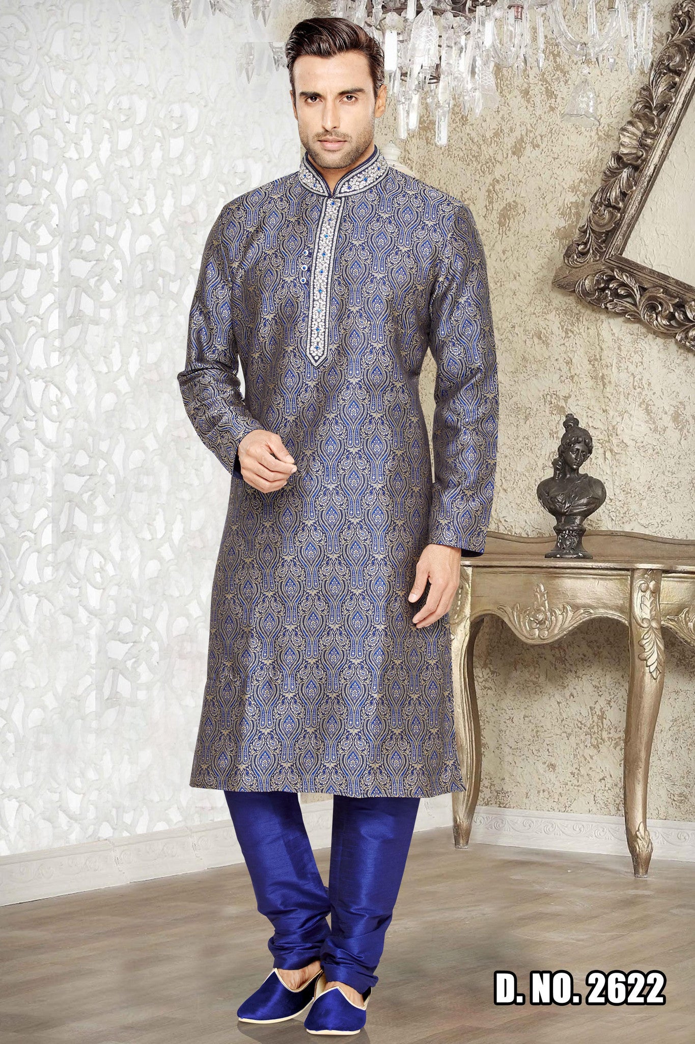 | Blue Jaqard Art Silk Kurta features foliage patterns all over. Bead button ornate placket and embellished side pocket patch adds to its look. Comes with matching bottom. PLEASE NOTE: All accessories shown in image including mojaris, stole and turbans are for shoot purpose only. |