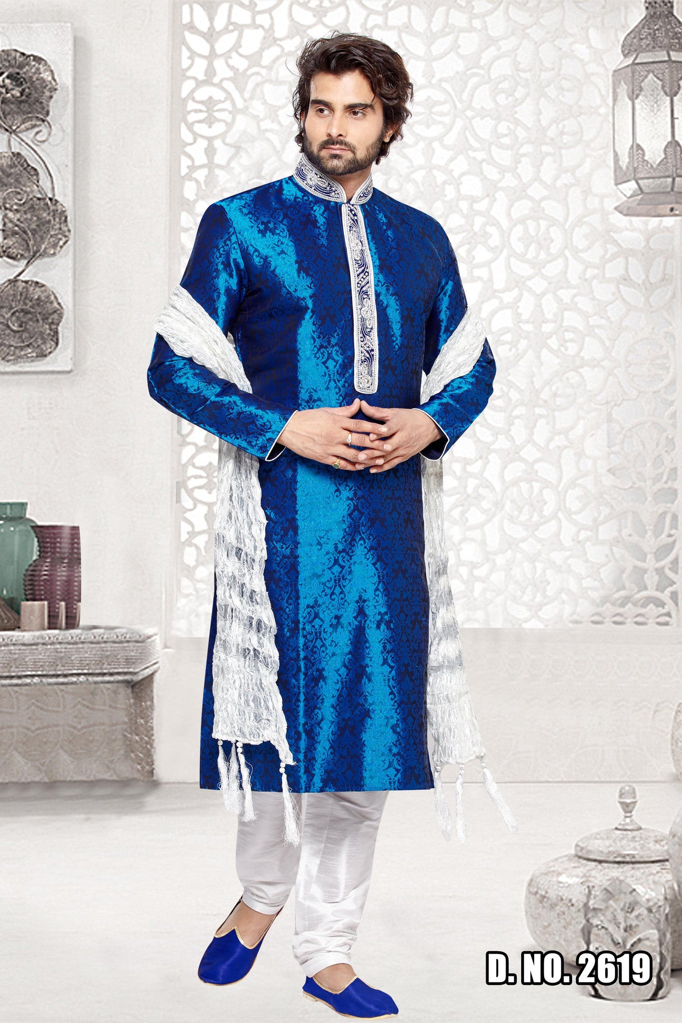 | Brocade Art Silk Blue Designer Kurta features foliage patterns all over. Bead button ornate placket and embellished side pocket patch adds to its look. Comes with matching bottom. PLEASE NOTE: All accessories shown in image including mojaris, stole and turbans are for shoot purpose only. |