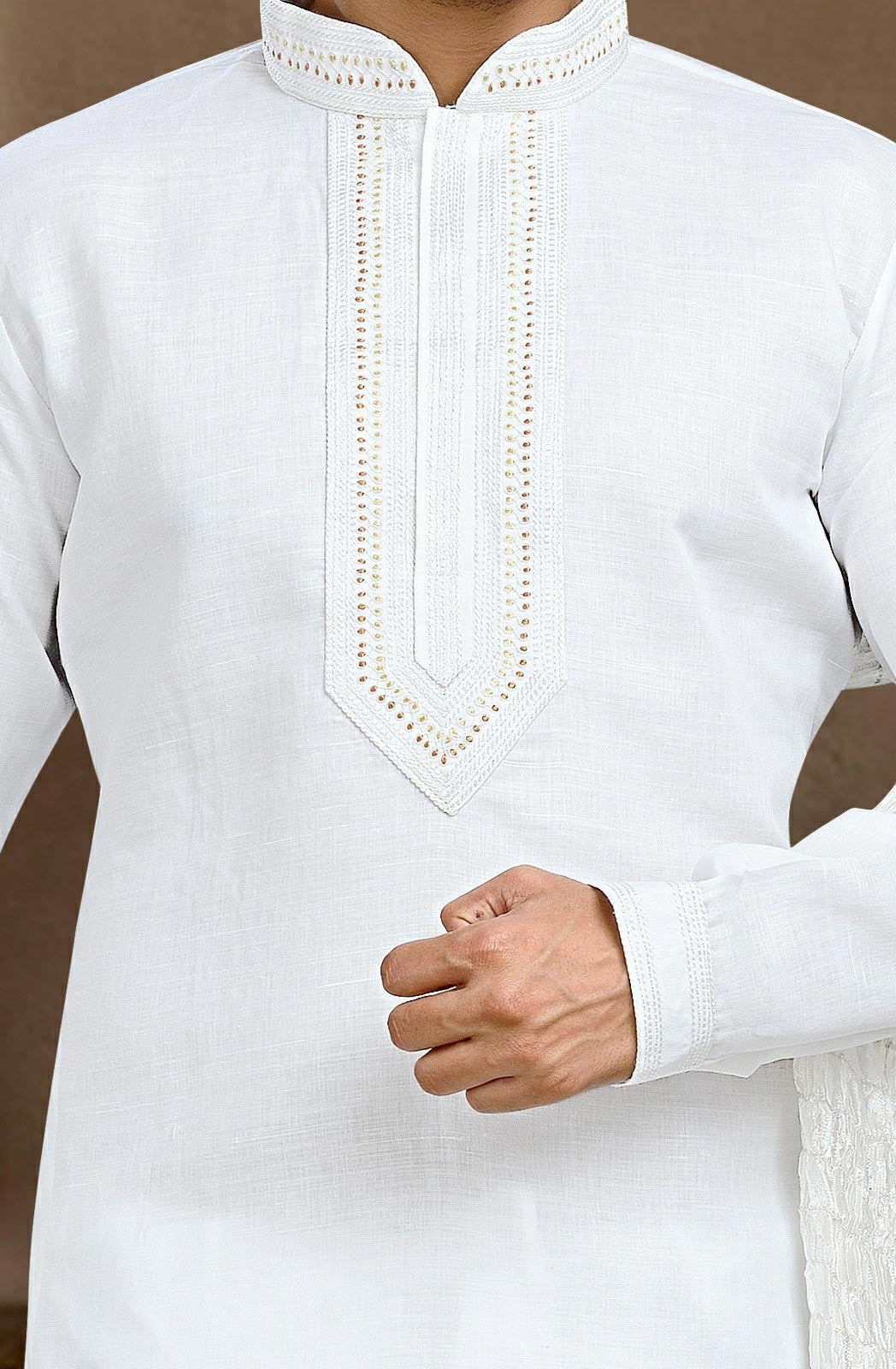 Off White Cotton Linen Kurta Pyjama With Patch Work