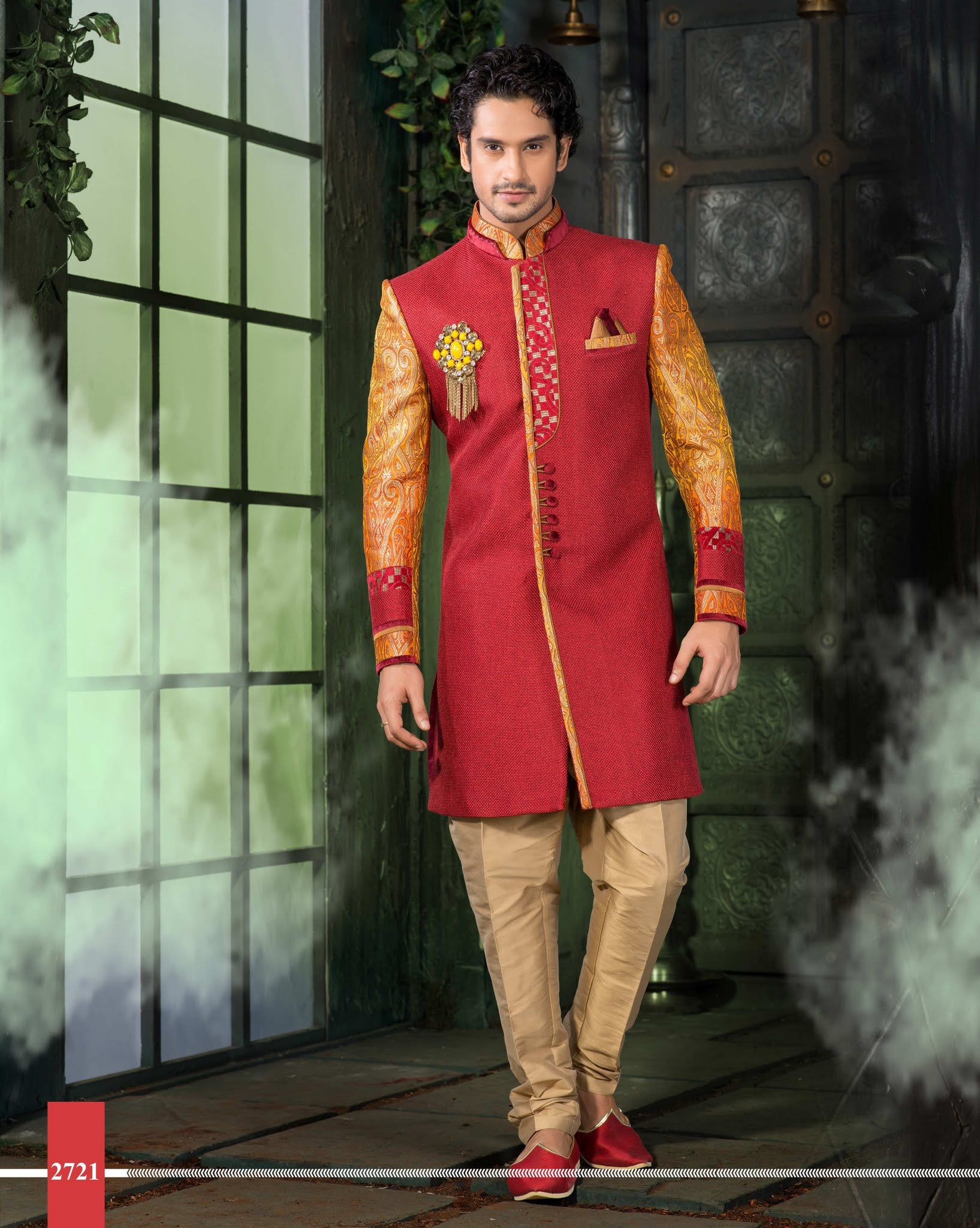 Red Jute With Jamewar Pure Silk Indowestern