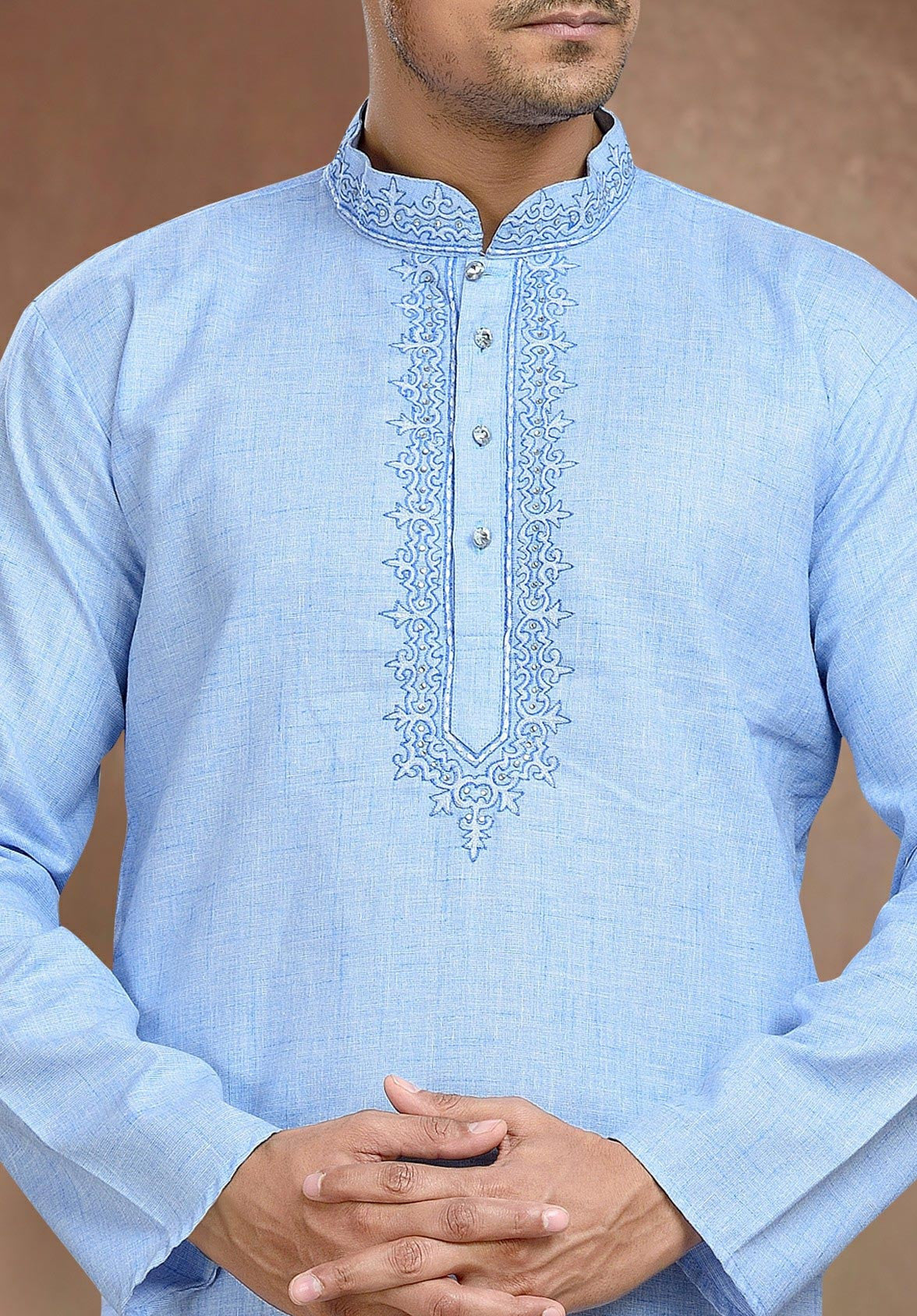 Sky Blue Cotton Kurta Pyjama With Embroidery Work