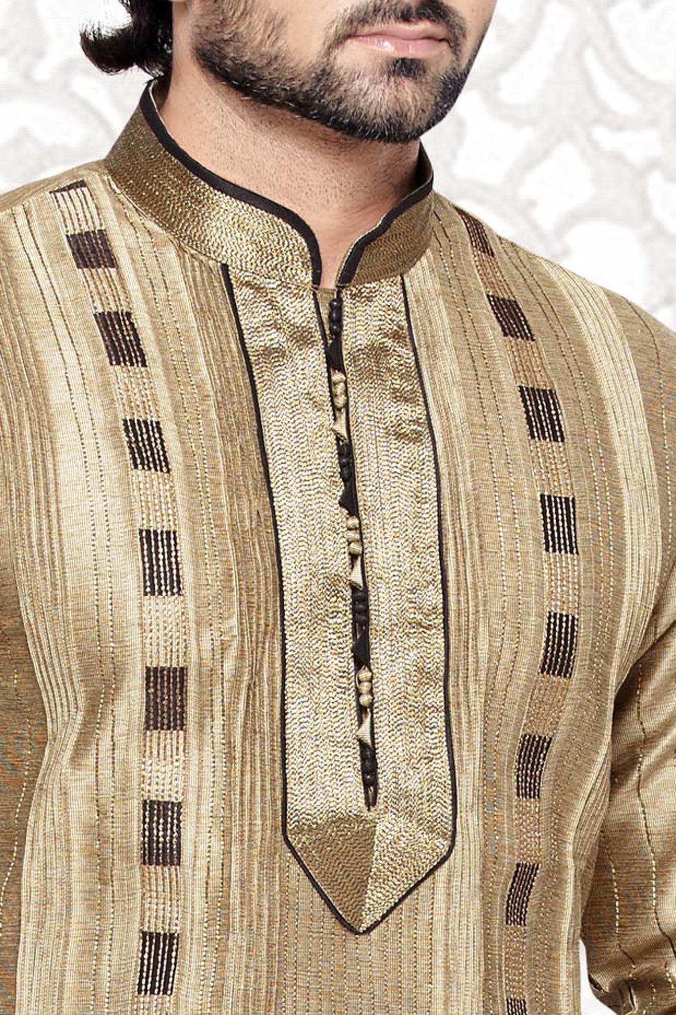 | Tusser Art silk Kurta features foliage patterns all over. Bead button ornate placket and embellished side pocket patch adds to its look. Comes with matching bottom. PLEASE NOTE: All accessories shown in image including mojaris, stole and turbans are for shoot purpose only. |